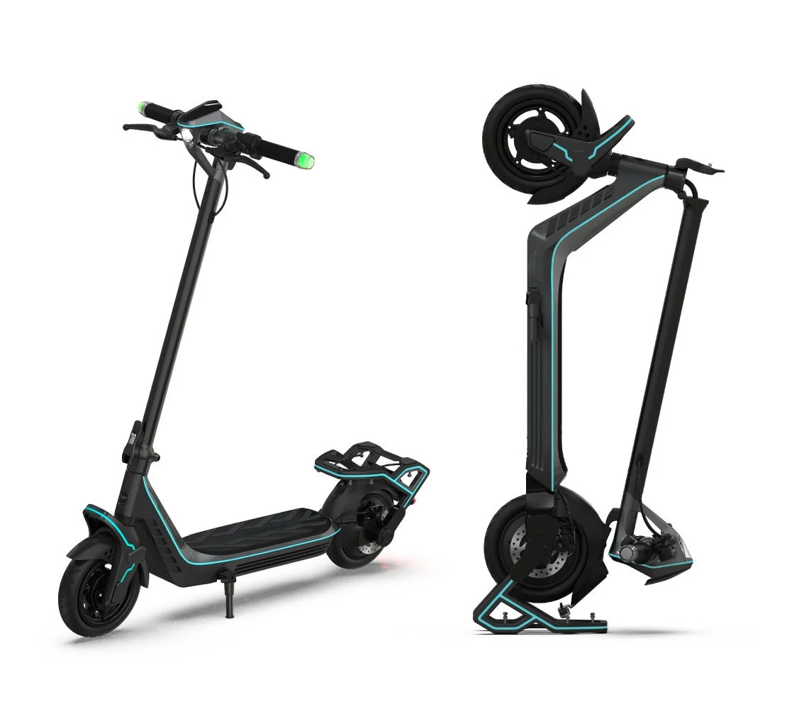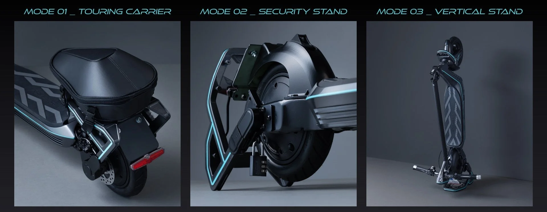 河森正治氏のデザインワークスのキーワードとなる「3段変形」の要素が、日常生活での実用性と両立する形で機体設計に反映されています。都心でも郊外でも、シーンを選ばずに快適に使用できるよう、3通りの用途を持ったスタンドを搭載しています。